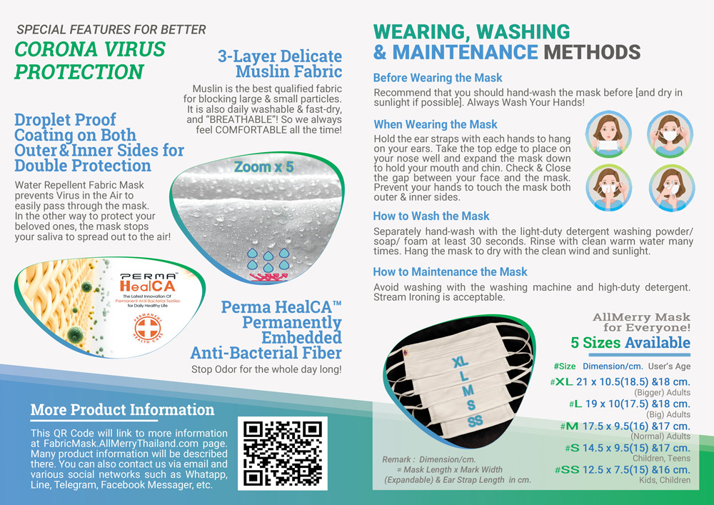 QR Code printed on the label sticker [which is attached on the packaging of every mask] will link to the website www.AllMerry.com or www.AllMerryThailand.com at Product Detail page. Many product information will be described there. You can also type your inquiry in the contact form. Our CS staff will response within 48 hrs.